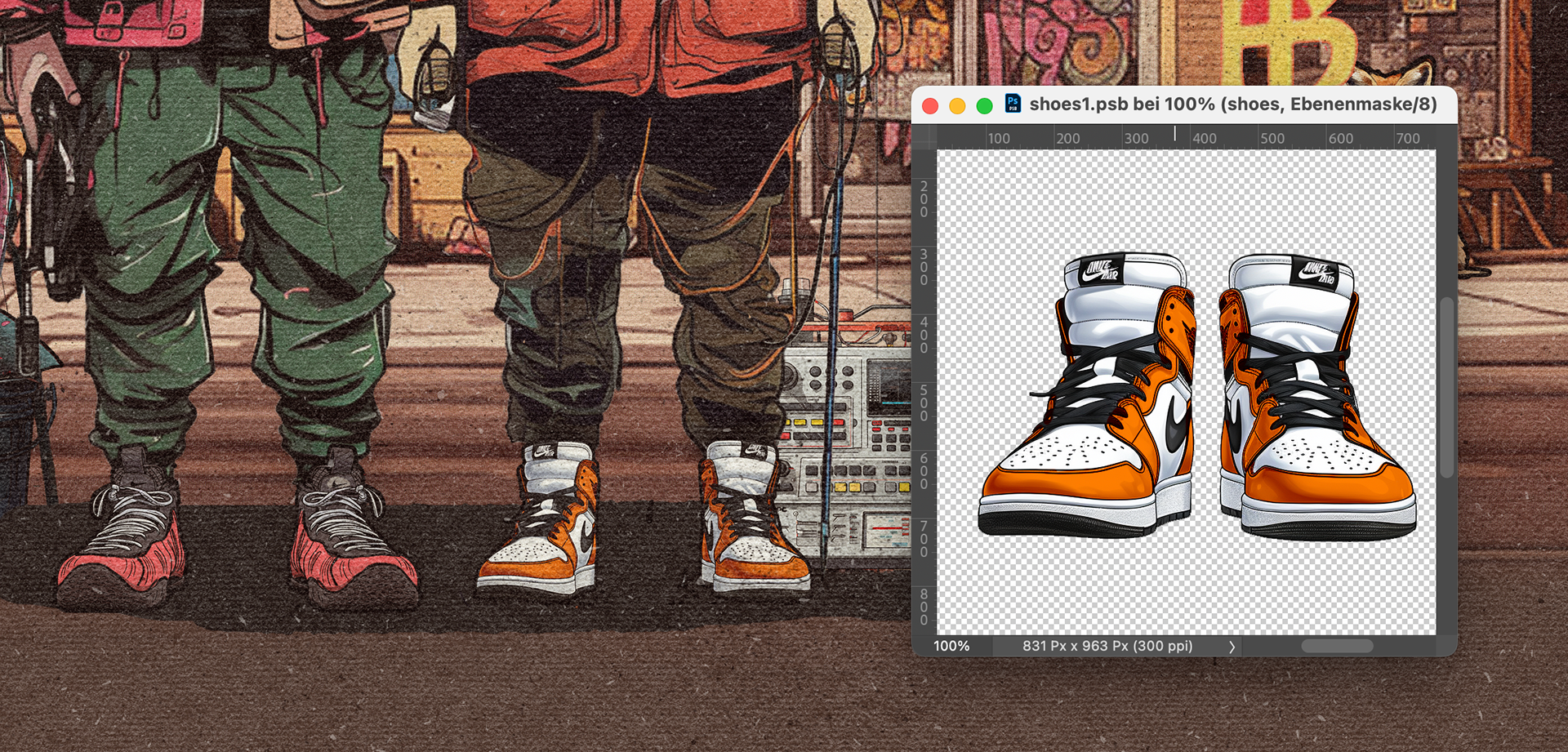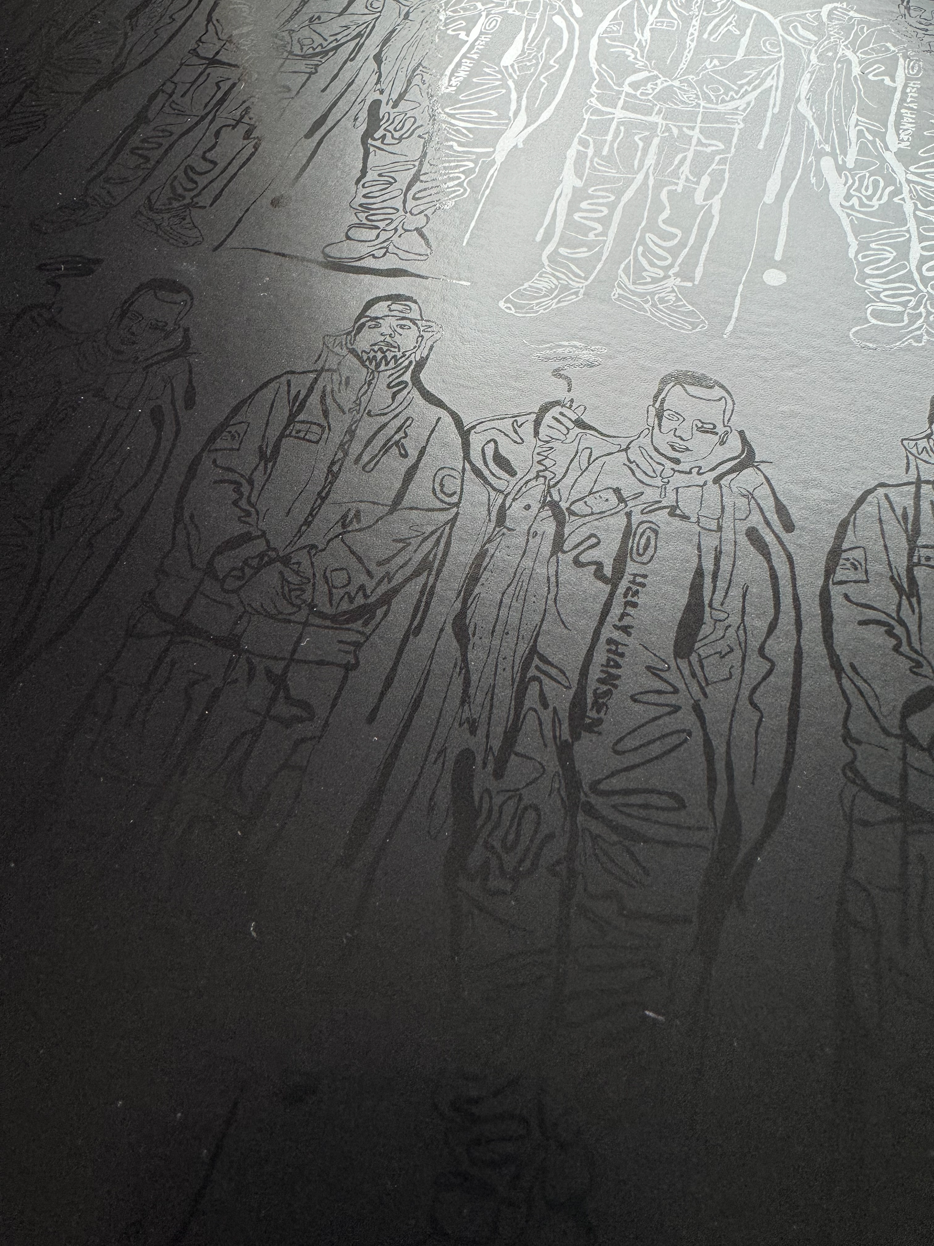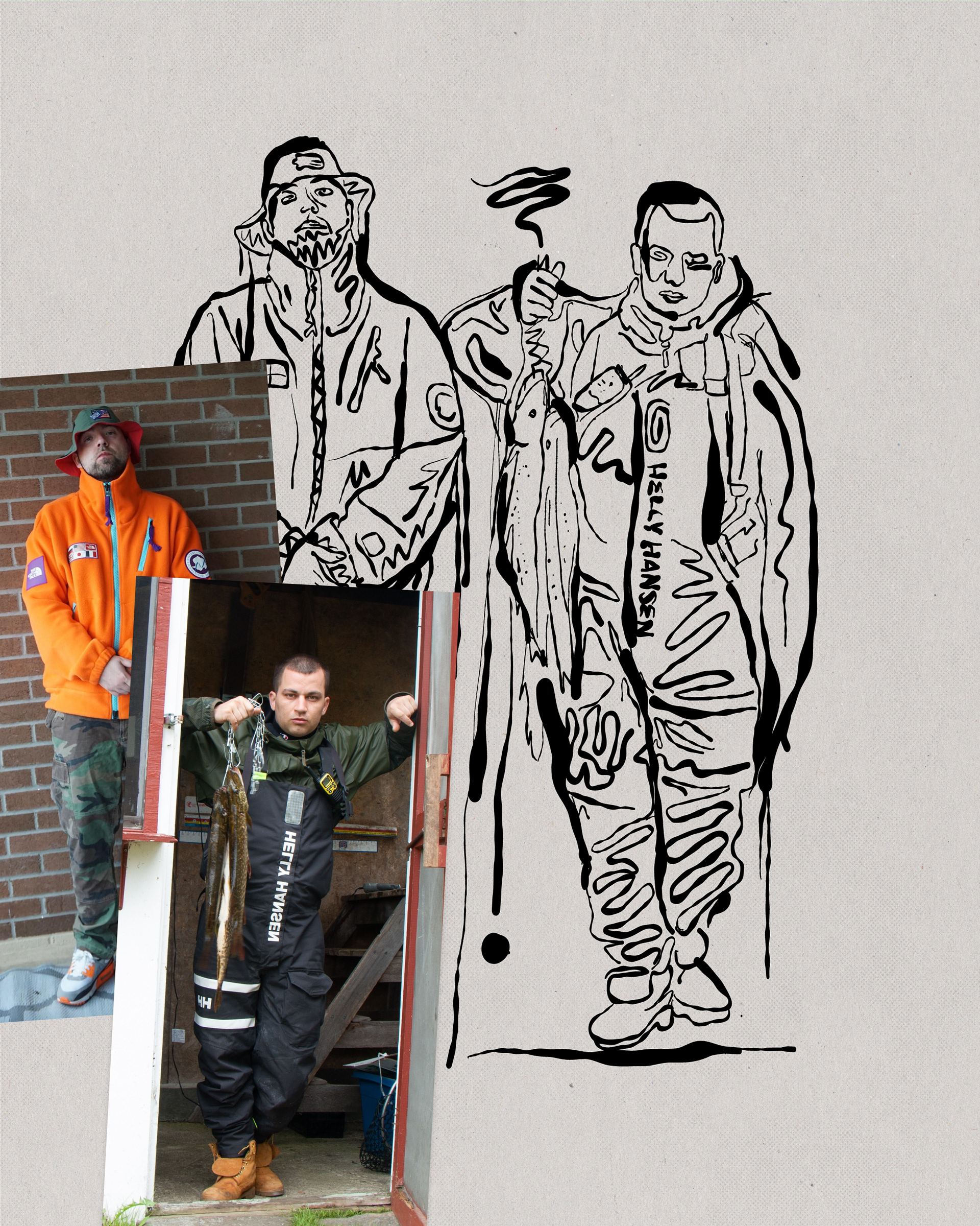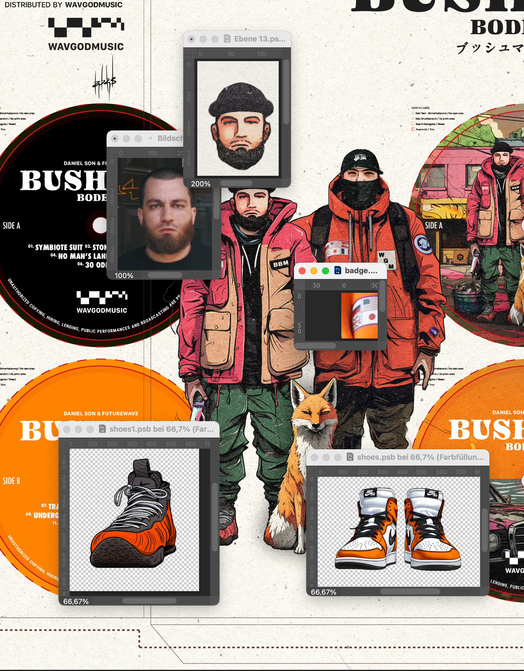 The artwork is a mix of very different assets like photos that I used to paint the faces or simply blended into the art as well as various graphical elements. Everything has been stitched together within photoshop and brought together to a similar style.